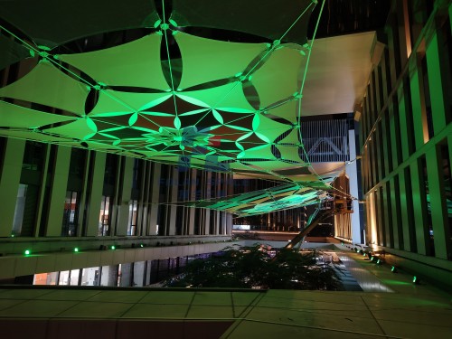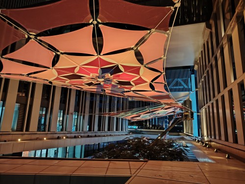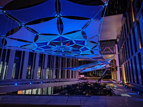 每一片“花瓣”都贴合结构力学的精准设计,膜材的柔韧勾勒出花瓣的自然弧度;夜幕降临时,LED偏光染色灯通过控制系统实现色彩渐变,紫、粉、黄、蓝、红的光线穿透膜面,似繁花缀光、灵动生长,既有建筑的严谨质感,又有自然的柔美肌理。