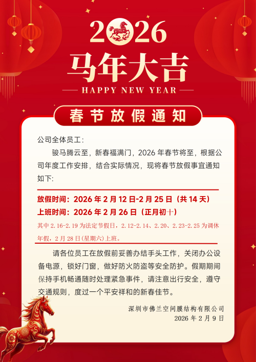 放假时间:2026年2月12日(腊月廿五)—2月25日(正月初九)复工时间:2026年2月26日(正月初十)