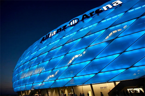 德国慕尼黑安联体育场建成于2005年,是一座可容纳67000人的足球场,也是世界上最著名的ETFE膜结构运动场之一。项目平面尺寸258m×227m,结构高度50m,下部支承结构采用钢筋混凝土框架体系,屋面采用大跨度悬挑平面桁架体系。采用2874块菱形ETFE双层气枕作为屋面和墙面的外围护体系,膜材厚度为200μm,ETFE总展开面积达到26000㎡。ETFE气枕外膜,可变换红、蓝、白三色灯光,是全球首个可变色体育场。