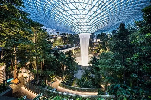 星耀樟宜机场(Jewel)是一个世界级多面相生活方式的据点,由花园和景点、零售和餐饮、酒店以及机场运营设施等众多项目组成。它拥有标志性的玻璃和钢结构外墙,总建筑面积达135,700平方米,是世界最大室内瀑布与穹顶气枕结构,营造热带雨林氛围。
