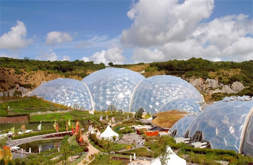 英国“伊甸园”温室项目是世界上第一个大型ETFE气枕式膜结构建筑,结构主承重体系由八个半径为18m-65m的六角形钢管穹顶构成,覆盖三层ETFE气枕膜结构,气枕形状有六边形、五边形,其中六边形单元的直径为5m-11m,总用膜面积达到29200㎡。该项目的成功建设,为ETFE膜结构在世界范围内的推广应用起到了示范和促进作用。
