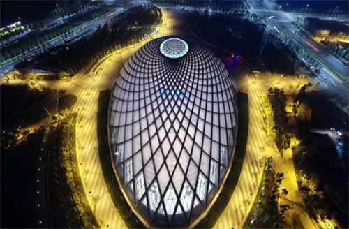 国际最大单壳体膜结构,其双螺旋穹顶由783个大小不同的ETFE气枕组成,长143米,宽80米,形成了独特的“贝壳”造型。该设计不仅美观,还解决了大跨度空间的保温、透光和隔热难题,同时配置了消防熔断系统,确保了消防安全。