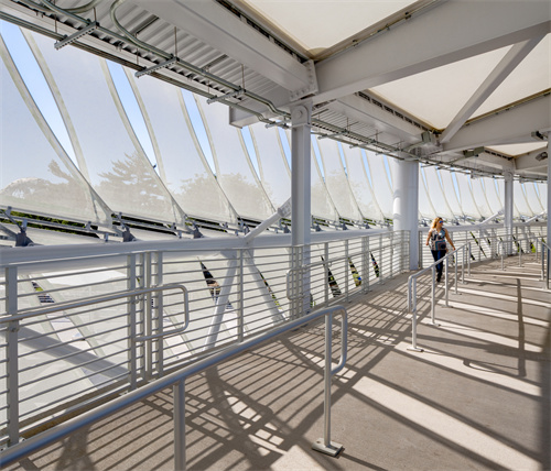 这种轻质膜结构与看台楼梯的巧妙结合,引导观众在半透明的顶篷下自由移动,并能欣赏到校园和公园的壮丽景色,将体育竞赛与休闲观景完美结合,营造出轻松独特的网球体验。