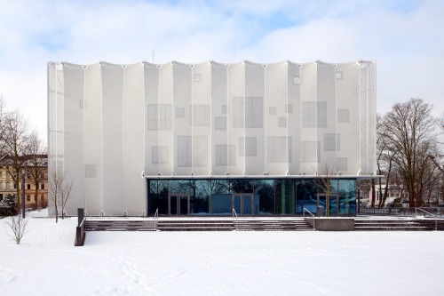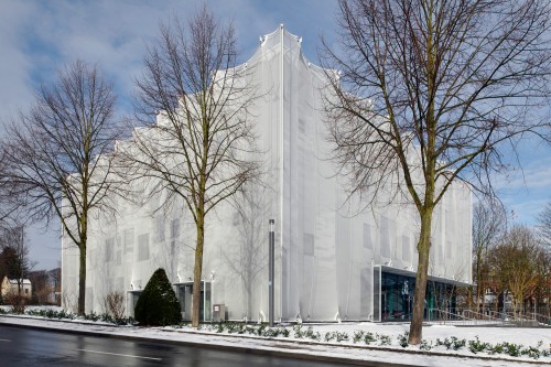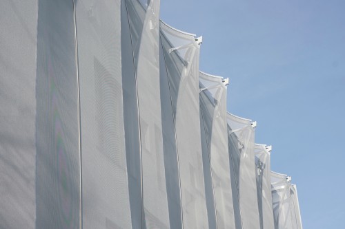 建筑主体为简洁的混凝土立方体,外覆银色PTFE网格膜系统。膜材如帘幕般呈波浪形环绕建筑,形成“柔软织物”与“刚性几何”的视觉对话。其半透明与反光特性,使建筑在不同时段呈现丰富的光影表情。