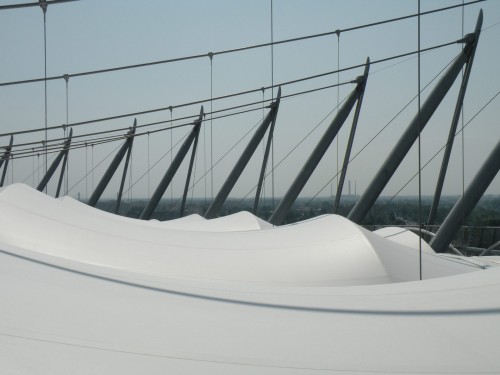 结构核心是“轮辐式”索网,像放大的车轮辐条。周边固定屋面为“竹节拱”马鞍型,5.4万平方米PTFE/玻璃膜材兼具耐用、自洁、透光性,让赛场通透又节能。