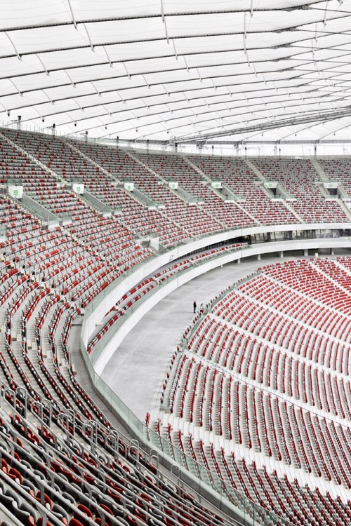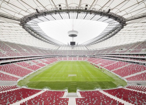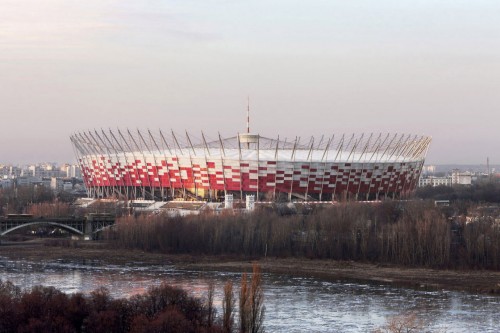 华沙维斯瓦河岸边的华沙国家体育场,是2012年欧洲杯主赛场之一。红白外观呼应波兰国旗,而最吸睛的当属可自由开合的膜结构屋顶,堪称全球体育场建筑界的“黑科技尖子生”。