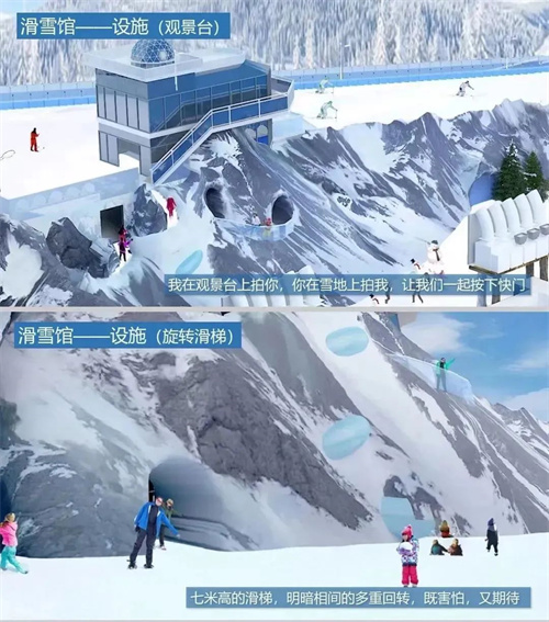 滑雪馆内的滑雪道长约90米、宽20米,出发平台高度10米,滑雪者可乘坐魔毯上升到出发平台。滑雪馆以经典雪域风光为主题,打造网红打卡点。