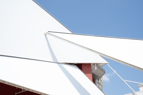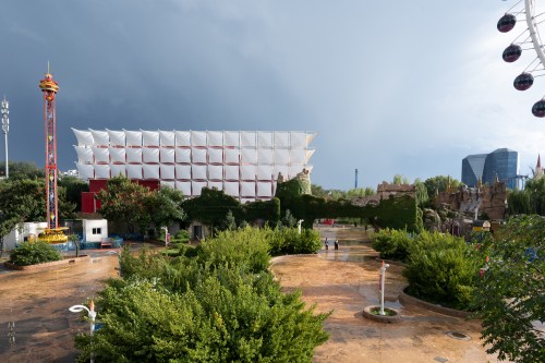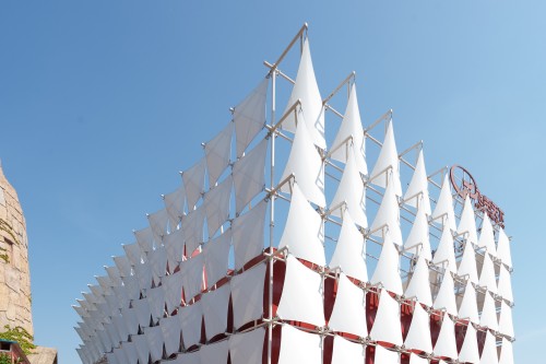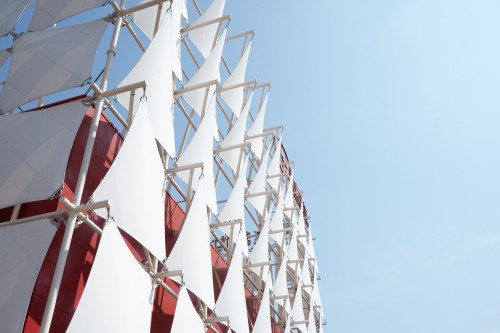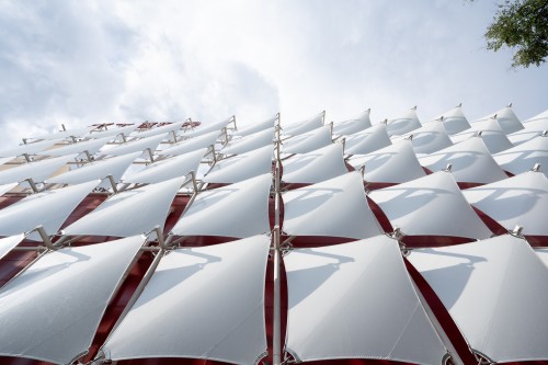 建筑采用了项目的主题色—红色,先建造一个满足建筑基本功能的体量,再通过在体量上叠加一个由膜材料构成的灵活形式,创造出一个动态形象,这样处理,不但缩短了施工周期,还大大降低了项目成本。